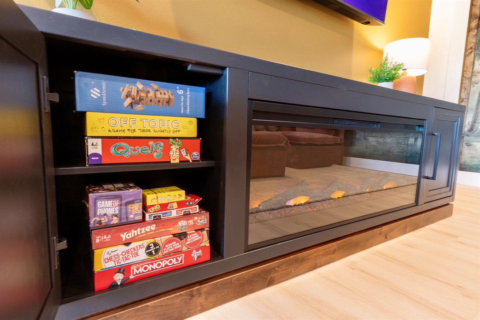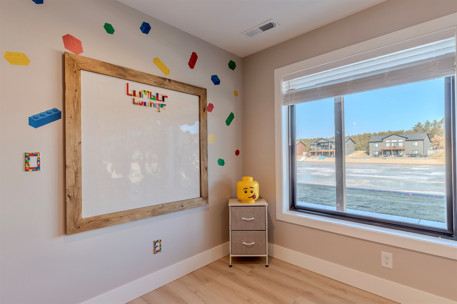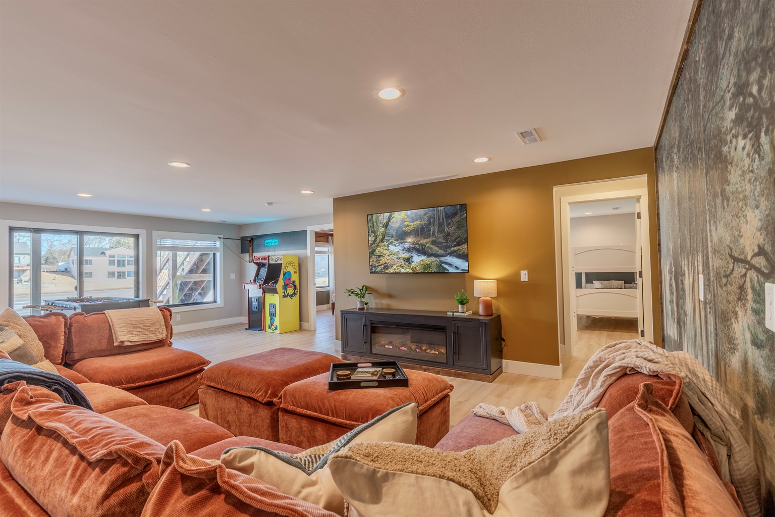 Whether your days are spent paddle boarding on the water, building creations on the LEGO wall, playing classic arcade games, or relaxing fireside as the sun sets, this home was curated to feel elevated, playful, and welcoming all at once. Don’t forget to snap a photo beneath the glowing “The Lumber Lounge” neon sign, a favorite spot for guests to gather and capture the moment.