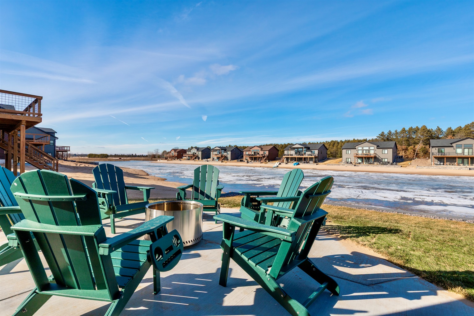 Step outside to enjoy a fire pit and grill for evening gatherings, along with immediate access to the sandy beach and lake, perfect for swimming, kayaking, paddle boarding, or simply relaxing by the water.