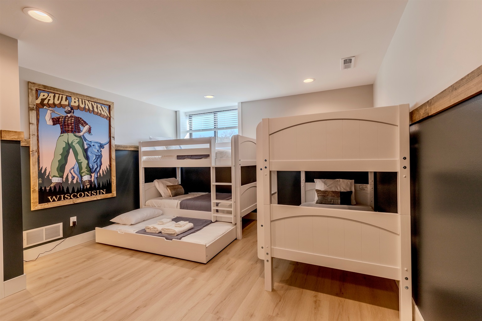 - Kids’ bedroom featuring two Twin bunk beds and one Twin trundle