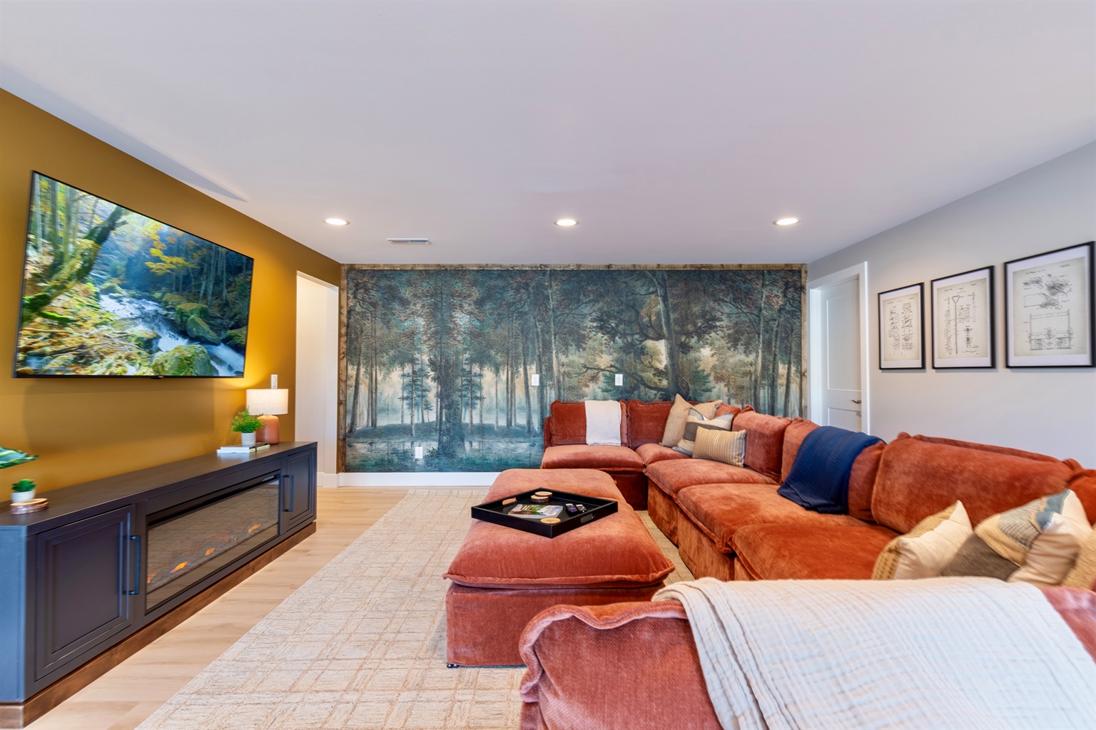Multiple gathering spaces designed for relaxation and connection, featuring comfortable seating, entertainment options, and curated design touches throughout. The main living space upstairs has a large dining table for gathering and a smart TV. It is highlighted by the signature “The Lumber Lounge” neon sign, making it a favorite hangout and photo spot. The downstairs living space has a large couch, fireplace, and a smart TV for a relaxing movie night.